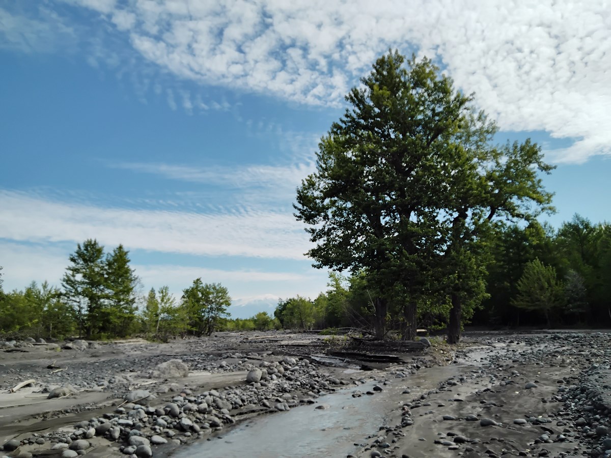 На следующее утро мы собрали лагерь и поехали… мы не знали в какое потрясающее место мы едем. Его называют камчатской Швейцарией. Там я надеялась залечить ногу до подъема на последний вулкан. Как-то так вышло, что по совершенно необъяснимой причине мне разрешили ехать в кабине нашего дома на колесах. А это значит видеть жизнь не только в одну сторону, но вперед и везде! А еще… это было потрясающее зрелище – сидеть в кабине, видеть внизу колеи дороги мне по колено и наблюдать как наша машина медленно, медленно пытается въехать в березу. Но в самый последний момент оказывается, что ни в березу, ни в колею мы не съедем. Это было душевосхитительным зрелищем. А если серьезно, то жизнь без дорог поднимает мастерство водителей Камчатки до виртуозного уровня – сидя внутри машины, мы даже не подозревали, какая дорога под колесами машины. Какое-то время дорога шла по березовому лесу. У камчатских берез есть особенная танцевальная грация – мало какая из них растет ровно вверх. Мы проехали каменную реку почти не заметную сейчас, но бурную и полноводную в начале лета.