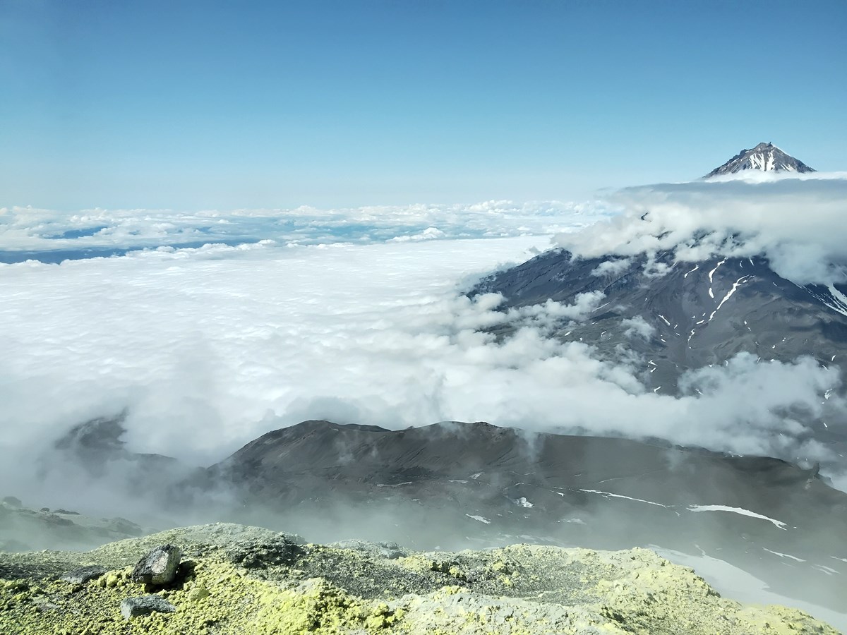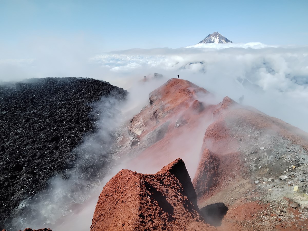 Наши гиды научили ходить в горы не уставая совсем. Мы поднялись. Сначала просто вверх, потом в мокрых облаках, потом выше облаков, в конце по жуткой сыпухе, которая вместе с ногами стекала вниз. Но мы поднялись. Мы не увидели панораму Питера, укрытого слоем облаков, но увидели черную лавовую пробку, заткнувшую жерло вулкана и контрастные склоны ярко кирпичного цвета, большие фумаролы ярко салатового цвета (выходы горячего вулканического газа и пара) и облачное море, из которого как острова возвышались вершины соседних вулканов. Не вся группа дошла, но у тех, кто увидел, впечатается это в память навсегда.