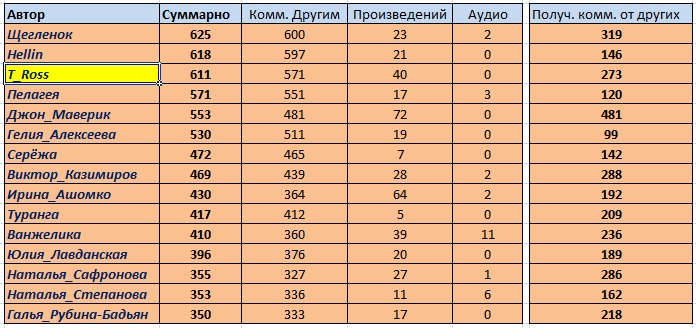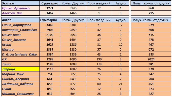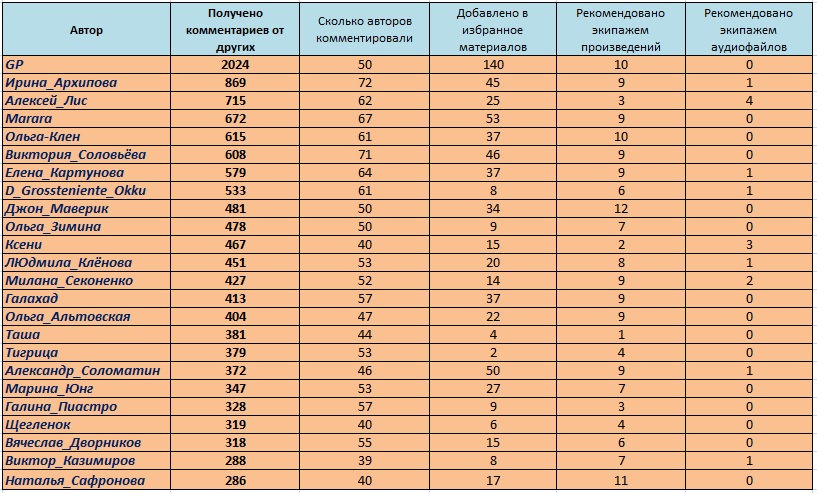 И я ещё добавил колонки "Сколько авторов комментировали" (т. е. вот эти самые полученные комментарии от других), "Добавлено в избранное материалов" (здесь имеется в виду сколько избраний вообще за год), "Рекомендовано экипажем произведений", "Рекомендовано экипажем аудиофайлов". Интересно получилось. И по полученным комментариям, и по добавлениям в избранное и в этом году победил Егор (GP). Это классно! Поздравляем, Егор!   Кстати, если кому-то интересны свои собственные данные за год (ну, вдруг вы не попали в таблицы выше), то можно меня спросить, я расскажу. Программа ведь считала по всем авторам сайта (исключая Архивных и Закрытых).
