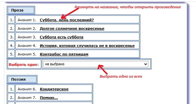В каждой группе нужно выбрать одно произведение, нажав стрелочку напротив красной надписи "Выбрать одно" и выбрав одно.