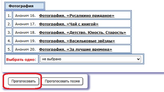3. Только когда во всех четырёх группах будет выбрано по одному произведению, можно нажать на кнопку "Проголосовать" (т. е. записать ваш выбор).