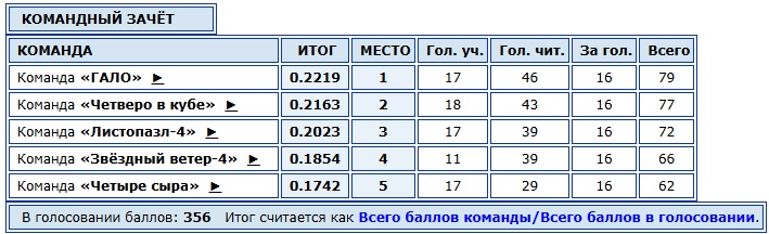 В командном зачёте у лидера 32 голоса (!), дальше 20, 19, 19, 14...