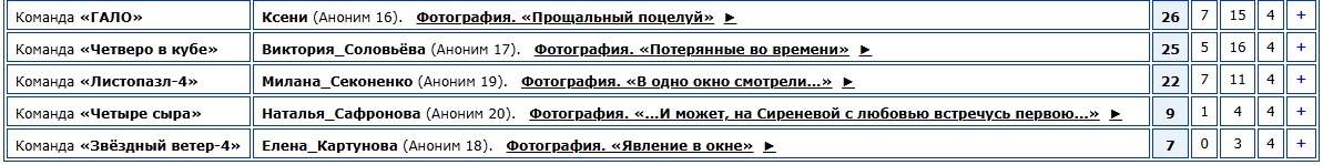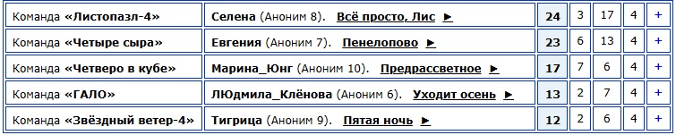 Игра закончилась. Немного грустно ( НО! В творческом багаже - бесценный опыт командного взаимодействия и объективная оценка собственных сил) Победителям - респект и уважуха, как говорит молодёжь) . Солидарна со словами капитана нашей команды: у нас - таких разных - и по характеру, и по творчеству - ПОЛУЧИЛОСь сыграться! И это сродни победы) Когда не знакомые и не взаимодействующие ранее друг с другом люди собираются в маленькое сообщесто и начинают творить и вытворять, и при этом всё очень даже неплохо получается - на мой взгляд - это здорово!