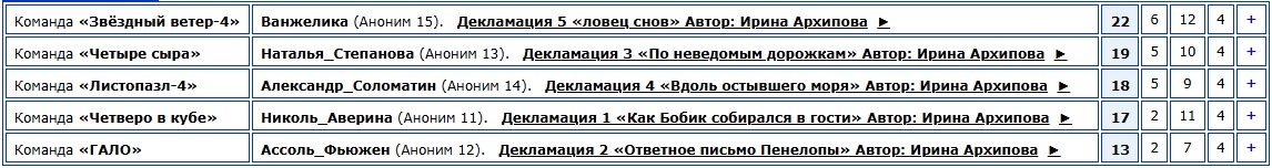 Победила декламация Команда «Звёздный ветер-4»: Ванжелика (Аноним 15). Декламация 5 «ловец снов» Автор: Ирина Архипова : 22