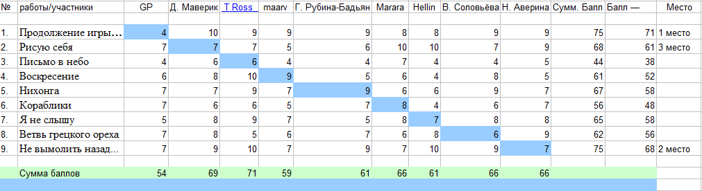 Самым экономным участником стал Егор (GP). Он раздал участникам в сумме пятьдесят четыре (54) балла. Гениальных стихов не обнаружил, впрочем, как и мастерски написанных.
