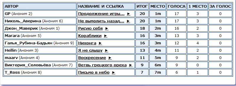 Поздравляю победителей! Было очень интересно поучаствовать. Спасибо всем, кто читал, критиковал, оценивал наши работы. Думаю, анонимное участие и, одновременно, критика анонимных текстов - это прекрасная идея. Не отвлекают никакие посторонние соображения, типа, приятельских отношений с авторами. Можно сосредоточиться исключительно на стихах. Полезный опыт)).