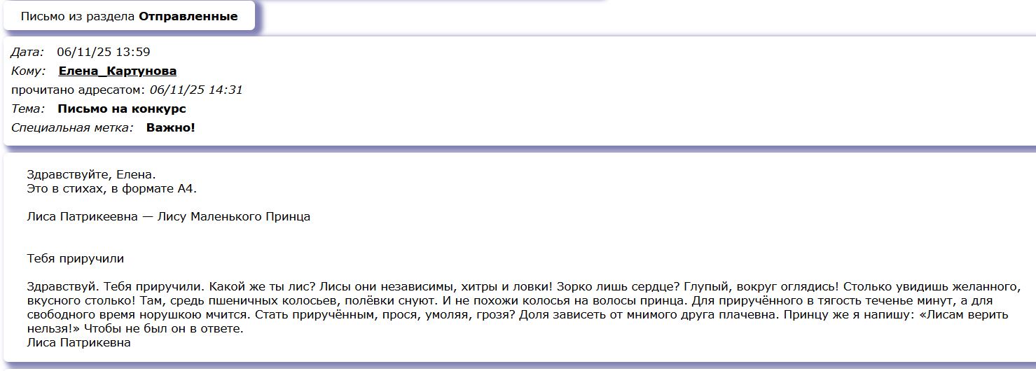 Здравствуй. Тебя приручили. Какой же ты лис? Лисы они независимы, хитры и ловки! Зорко лишь сердце? Глупый, вокруг оглядись! Столько увидишь желанного, вкусного столько! Там, средь пшеничных колосьев, полёвки снуют. И не похожи колосья на волосы принца. Для приручённого в тягость теченье минут, а для свободного время норушкою мчится. Стать приручённым, прося, умоляя, грозя? Доля зависеть от мнимого друга плачевна. Принцу же я напишу: «Лисам верить нельзя!» Чтоб не был он в ответе.