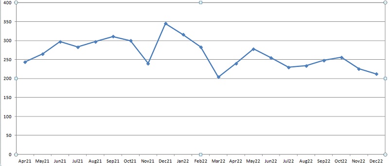 так вот, если взять с апреля 2021 по декабрь 2022, то там был минимум 204 в день (среднее, март 2022), а максимум 345 в день (декабрь 2021)