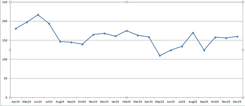 а если взять с апреля 2024 по декабрь 2025, то там был минимум в день 110 (апрель 2025), а максимум лишь 217 (июнь 2024)