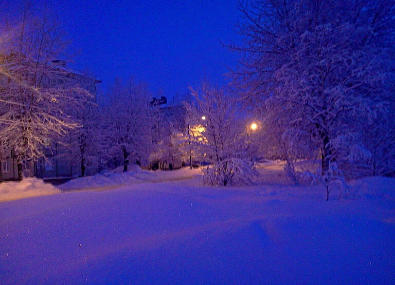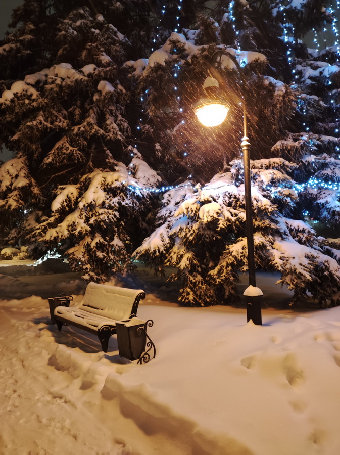 Очень заснеженный, мало подсвеченный город. Может быть, только этот микрорайон такой слегка заброшенный. А может, весь город такой. Красивая картинка получилась; холодом веет от неё – настоящая зима.