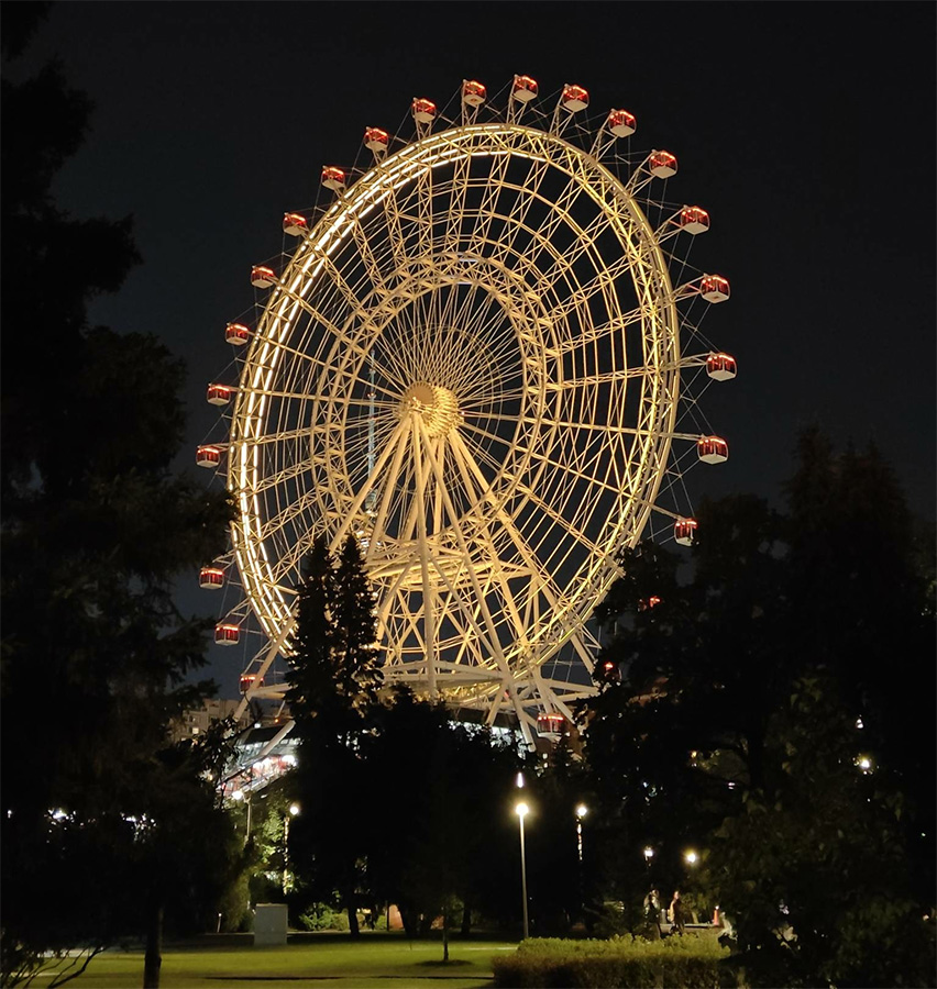 Колесо обозрения очень красивое, и подсвечено неплохо. У нас на пирсе Санта Моники по спицам его обычно цветовые волны гуляют; я и не припомню,чтоб оно было подсвечено однотонно. Но и в однотонной подсветки оно смотрится замечательно.