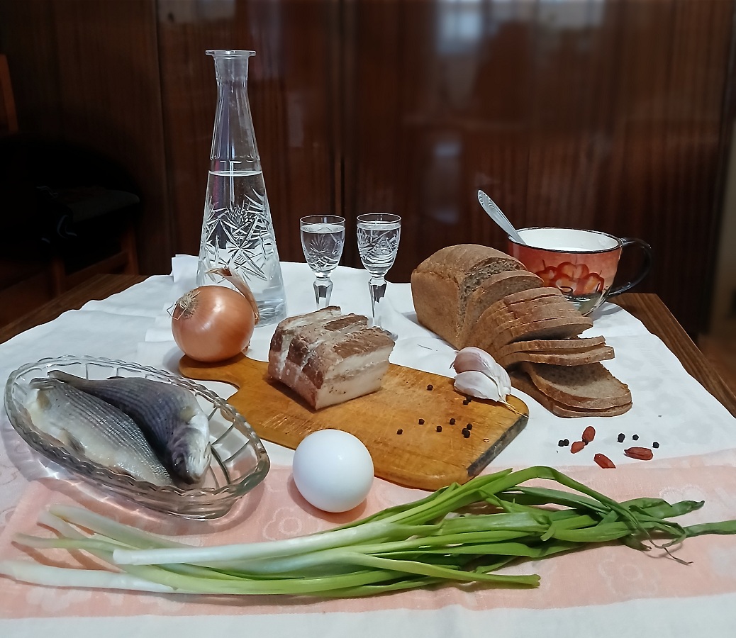 Лучок, чесночок, яичко, селедочка не очищены. Селедочка не порезана, лучком не посыпана. Стекло графина без "слезы". Поторопился автор. Недоработочка...