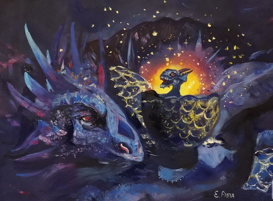 Удары сердца - камнепад, прибоя грозная ритмичность. Его дыхание - вулкан... Но это позже. А пока натужно лопается мрак стены обители яичной. И наконец, глубокий вздох! и сладость первого глотка. Худ. - Елена Рипа