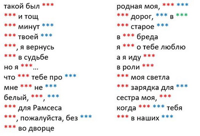Загаданные слова заменены на три звёздочки. Если из названия взяты два или три слова, они заменены на звёздочки разных цветов.