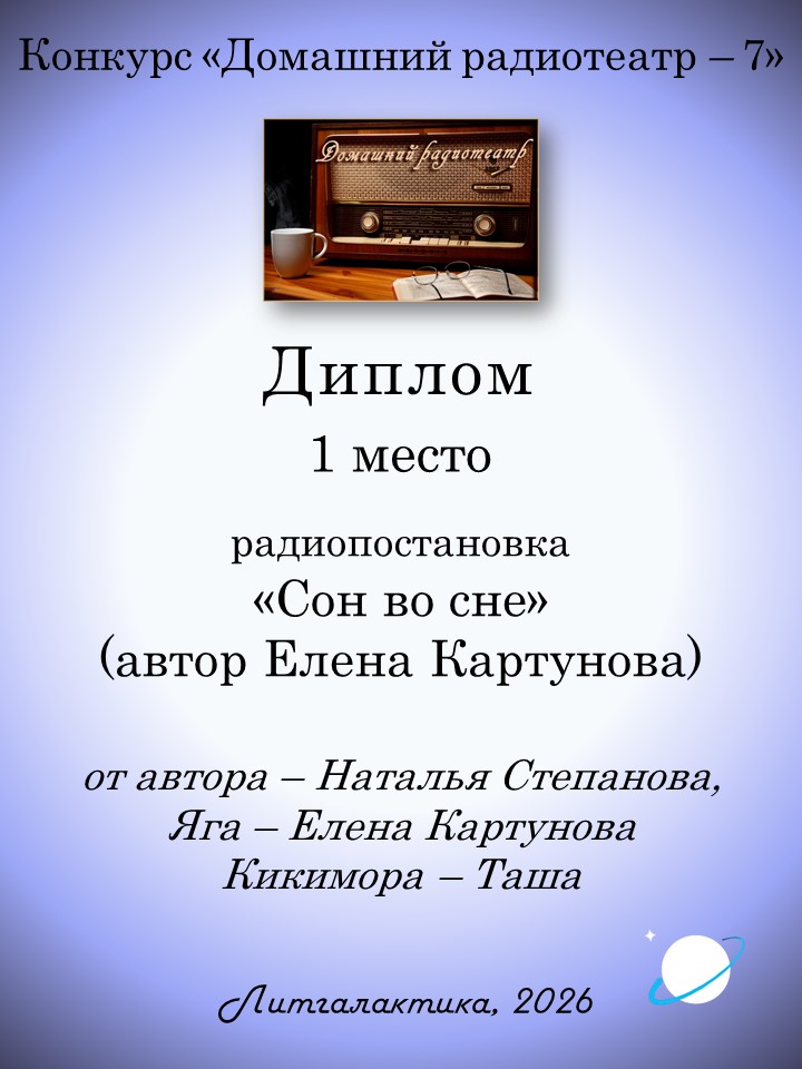 1 место произведение: Сказка из серии «Лесные хроники» - «Сон во сне» (автор: Елена Картунова) Автор - Наталья Степанова Яга - Елена_Картунова Кикимора - Таша звукорежиссер - Елена_Картунова