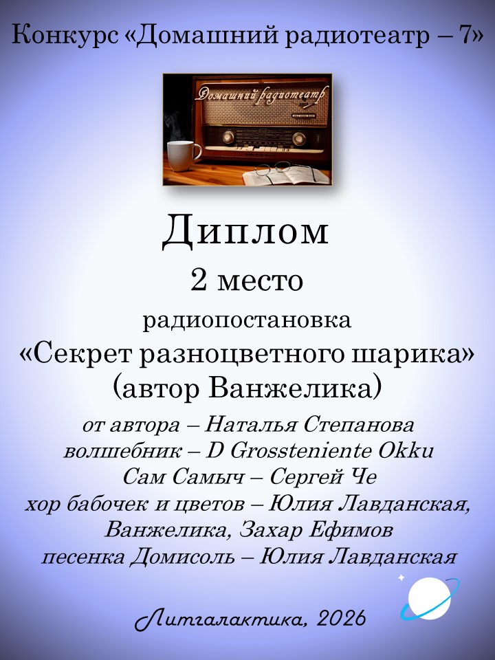 2 место произведение: «Секрет разноцветного шарика» (автор: Ванжелика) слова Автора - Наталья Степанова Волшебник - D_Grossteniente_Okku Сам Самыч - Сергей Че Хор бабочек и цветов - Юлия Лавданская, Ванжелика, Захар Ефимов Песенка Домисоль - Юлия Лавданская звукорежиссер - Женя_(Гнедой)